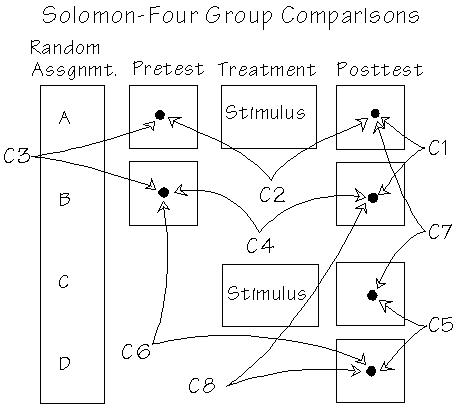 The Solomon four group design adds two more control groups. The posttest of Group C is compared to the posttest of Group A in comparison 7 to see what effect the pretest has in combination with the stimulus. If the posttest measures of Groups A and C differ, you know the pretest either influences the posttest directly or it influences the effect of the stimulus. In either case, you will be concerned.