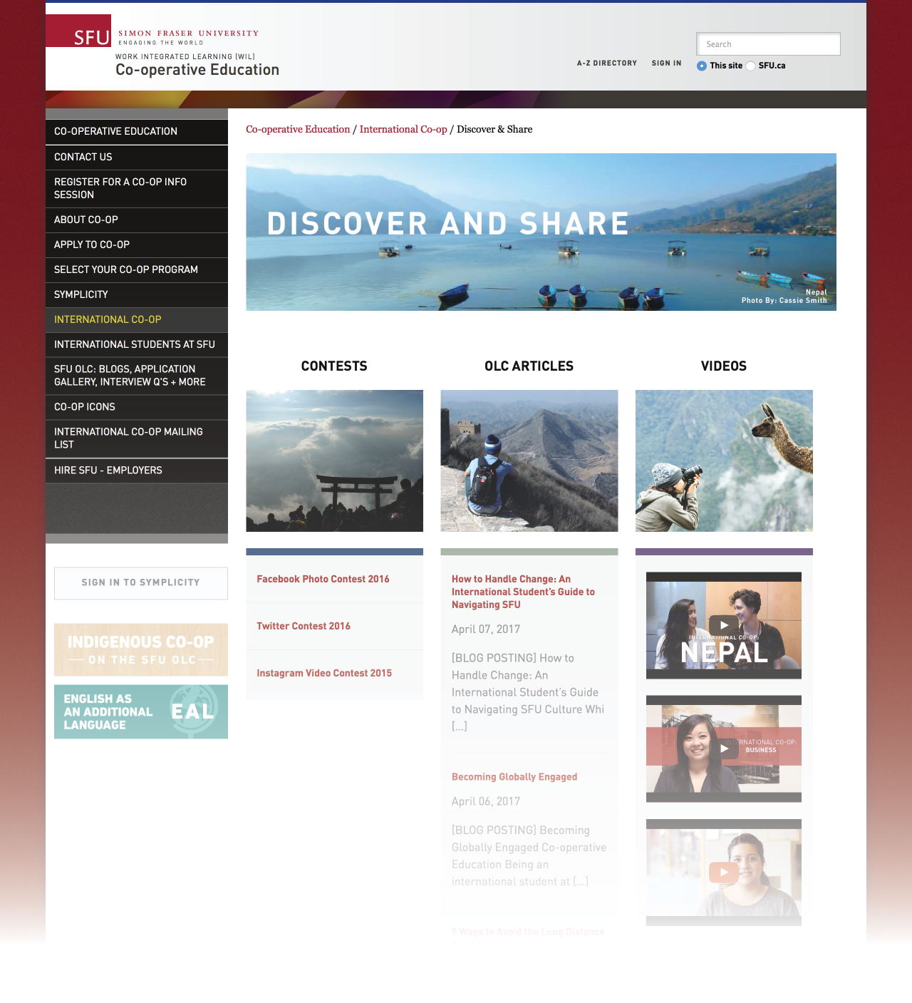 Web coding and design was one skill I wanted to improve upon and so I challenged myself to undertake a larger scale project to improve the user experience of the International Co-op website. Upon browsing it, I noticed contest pages, YouTube videos, and blog posts capturing students’ International Work stories were scattered throughout the website, making it difficult to find and access these important resources. My solution is to consolidate these resources to one access point. Following a few rough wireframe sketches and HTML/CSS coding within Adobe Experience Manager, “Discover & Share” took shape – a hub for students to discover stories about International Co-op or share experiences of their own through three mediums: contests, videos, and blogs (SFU’s OLC). This page is responsive and features device-specific animations as a tool to provide context in an interactive way while simplifying the information on the page.