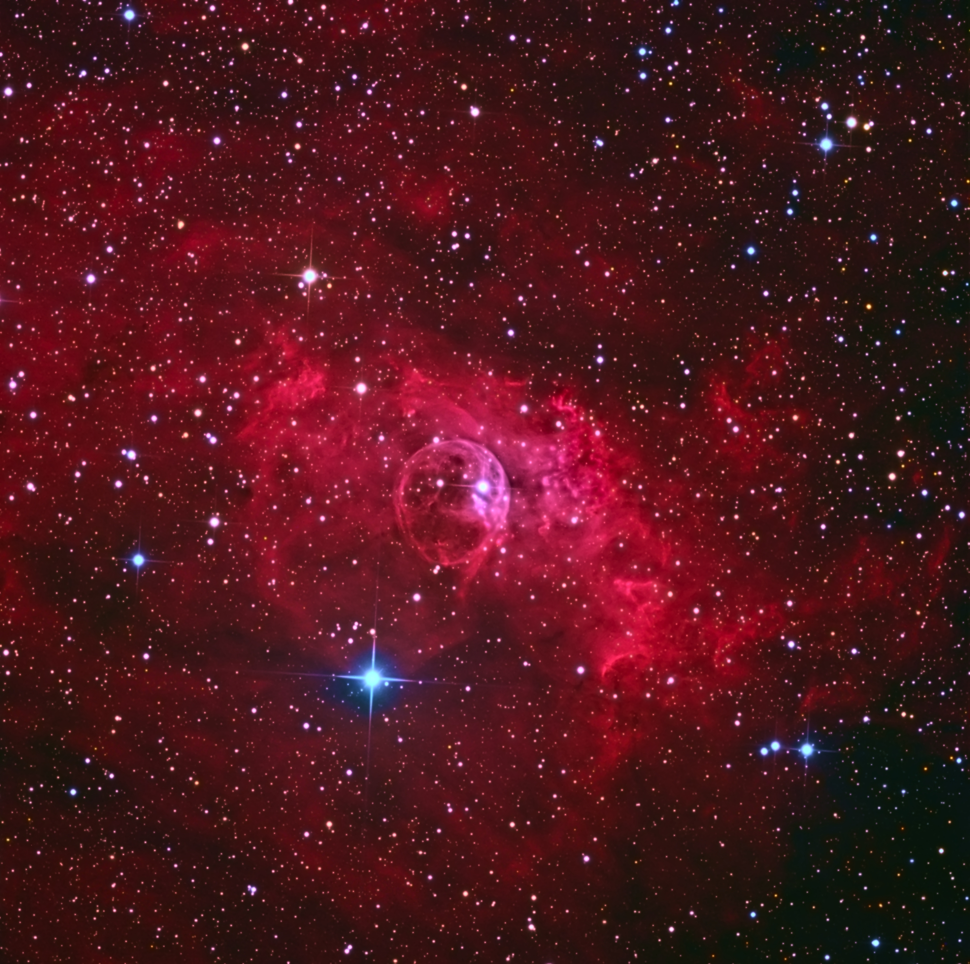 I hadn't planned on shooting in H-alpha, until I discovered how little of the nebula was present in the broadband red, when I did some quick processing of the LRGB frames from the first few nights of imaging. Unhappily, the weather took a nose dive in the 2nd and 3rd weeks of July, so it wasn't until near the end of the month that I was able to take some Ha frames. By then, I had become fixated on the Ghost Nebula, and for the first time since I commissioned my observatory, I put an unfinished target on hold to purse another (and then another!). I didn't get back to the Bubble until the last two nights of our summer at the Cabin in the Sky, taking quite a chance on coming up short, but happily the weather gods kindly gave me those two nights to complete the project ;).