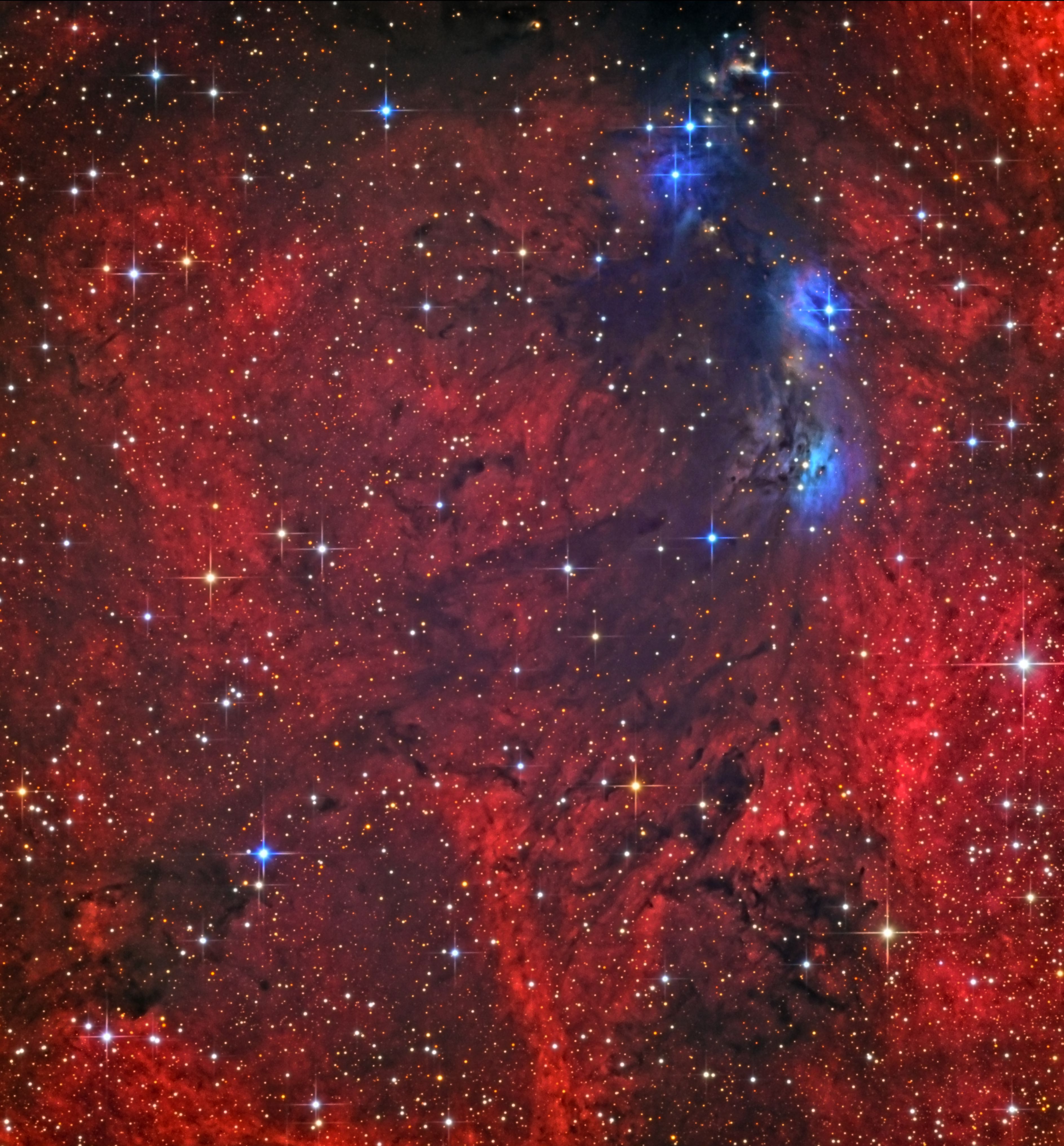 A brilliant blanket of red emission nebulae encompasses a intricate web of reflection nebulae of varying shades of blue, with the field shot through by stars of many vivid colours. Towards the middle of the frame the blue nebula fades gradually in colour and intensity, giving way to very dark clouds in an apparent transition that seems almost unique in the sky!