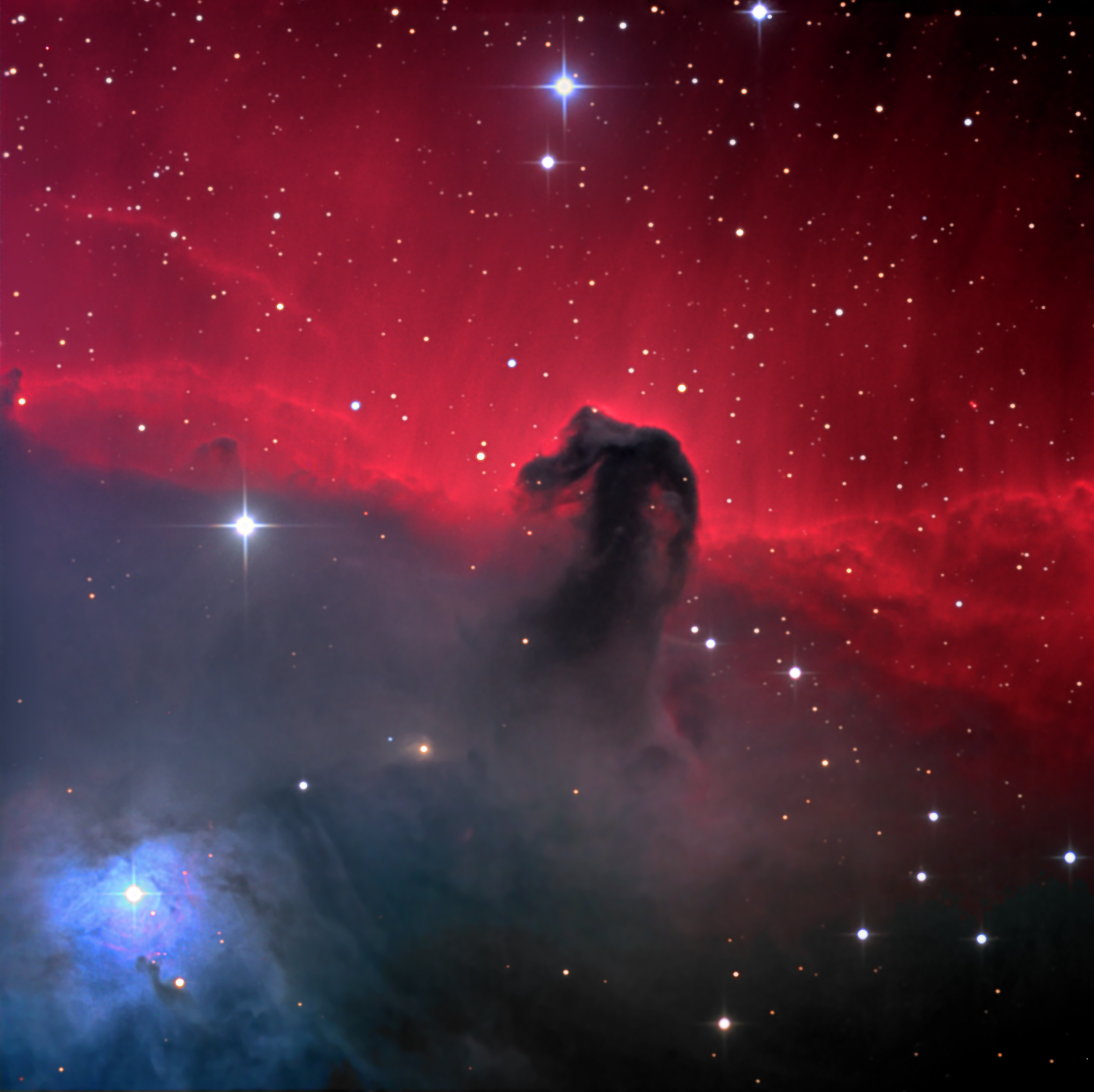 Processing details: When I set out to process this image, I didn't think much would come of it, since I only had 3 raw frames in each of the 4 colour channels, and just 3 hours of total exposure. There was of course no choice but to do a straight median combine in the colour channels, and to clean up a bunch of hot pixels and cosmic ray tracks using clonestamp. Happily, the signal to noise was generally very strong, owing to the relative brightness of the Horsehead. I blended the Ha with both the R and L frames to try to get a "natural" color with added depth in the emission nebula, and worked very hard to bring out as much of the dusty cloud at the bottom of the frame as I could.