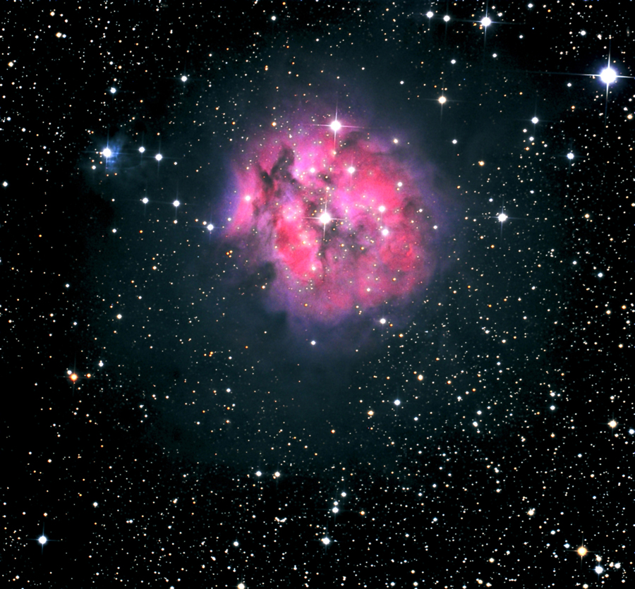That Friday night and into dawn on Saturday morning Mehrdad helped me frame the following image of the Cocoon Nebula, IC 5146, also known as Caldwell 19. This lovely object lies in a star-jeweled region of the Milky Way in Cygnus. It brings to mind a galactic pink-red wild rose! It has been on my imaging list for over two years, since I first read about it in Stephen O'Meara's book The Caldwell Objects. I've been fascinated by its gorgeous colours and textures, with hints of blue reflection nebulae bordering the red emission region, and with a dark dust lane, cutting across this frame from top-right to middle-left, obscuring background stars. The brilliant stars of many colours crowding the bottom-right corner of this frame give the impression of having been swept there by the dark lane.