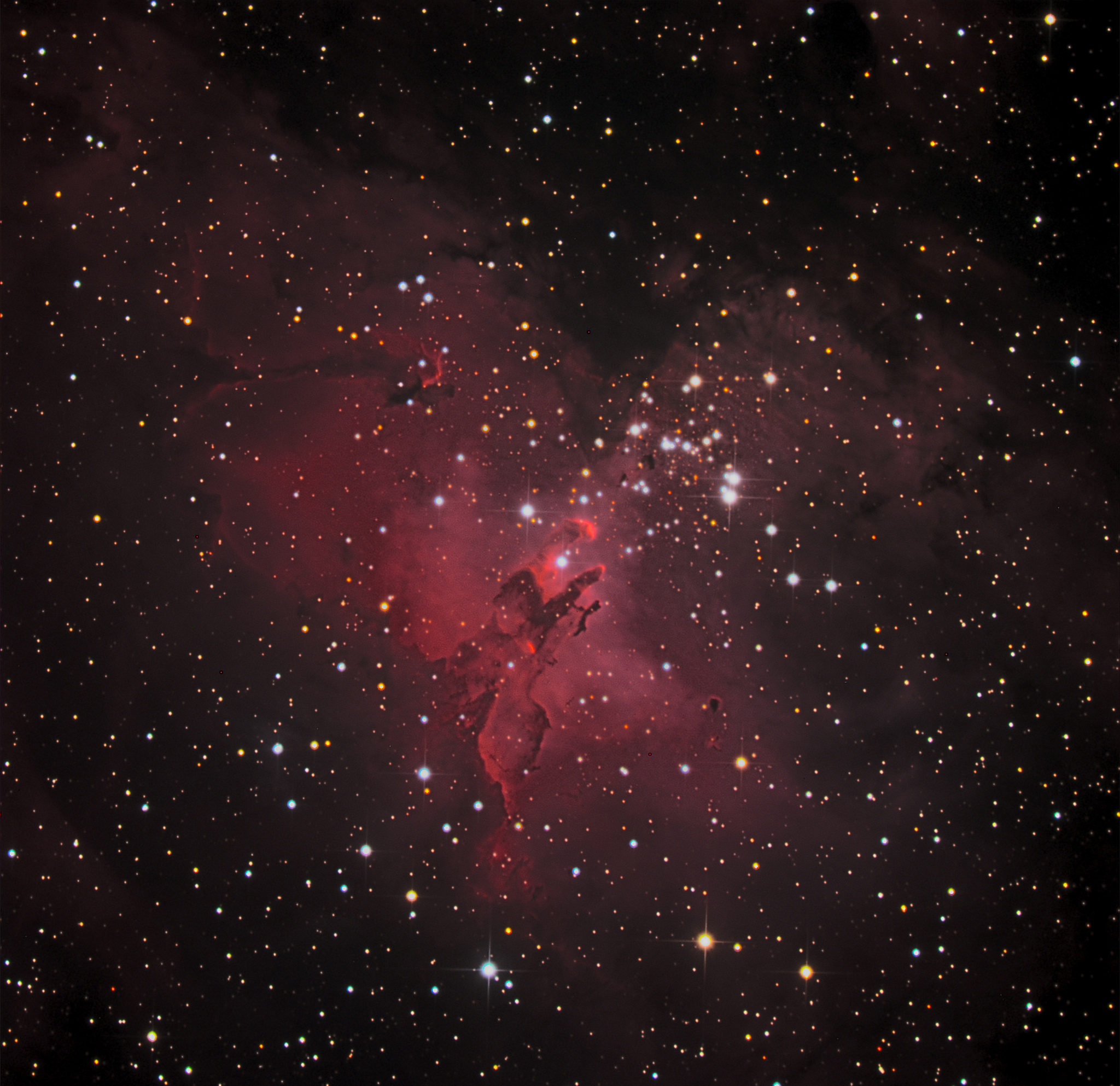 I asked my family to vote on the object they wanted to image (I gave them a list in advance of four objects to choose from), and the Eagle was the favourite by far. Sylvie told me that when she was a kid, she loved the picture of the Eagle that her Dad had on his wall. She thought that the "pillars of creation" looked like sea horses, and wondered how they could be so far out in space ;). The image below is about 30 minutes of total exposure in LRGB - the atmosphere was very turbulent that night, hence the stars are quite bloated. Click the Eagle image at the bottom of this page to pop-up the full resolution version. I'm going to give this beautiful object another try under better conditions!