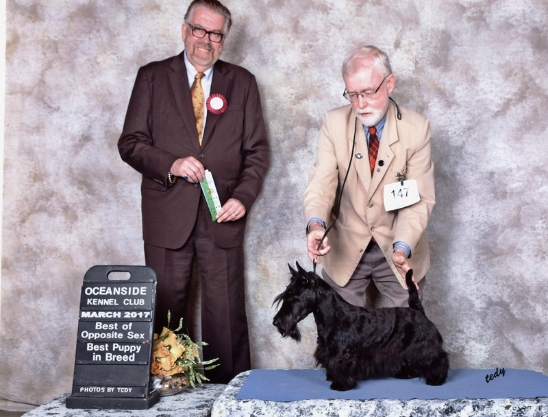 ![]() At 9 months of age, Dougal goes Best of Opposite over Male Specials under Scottie breeder judge Jim Reynolds! |