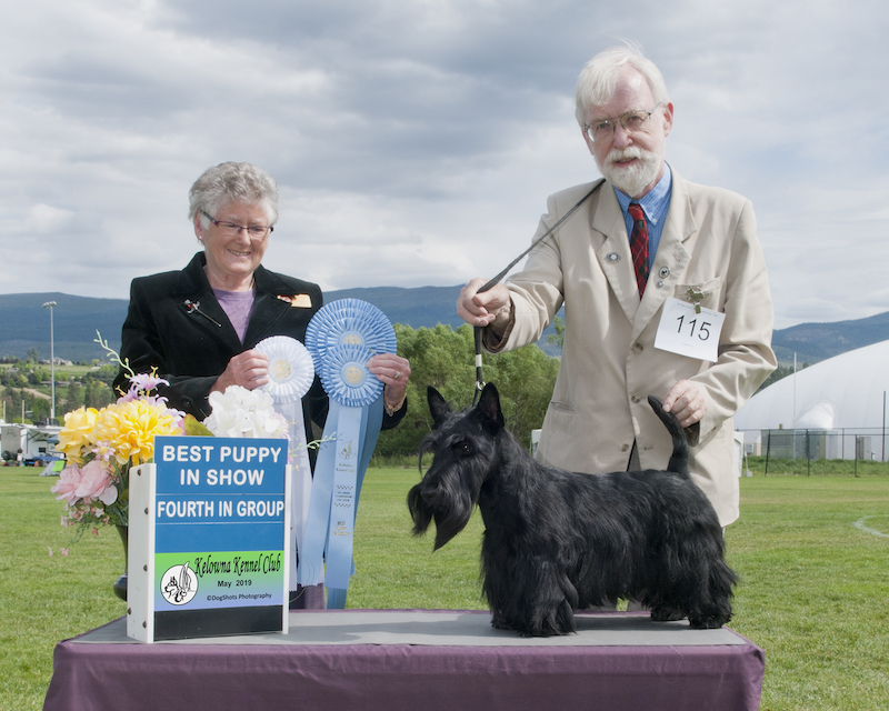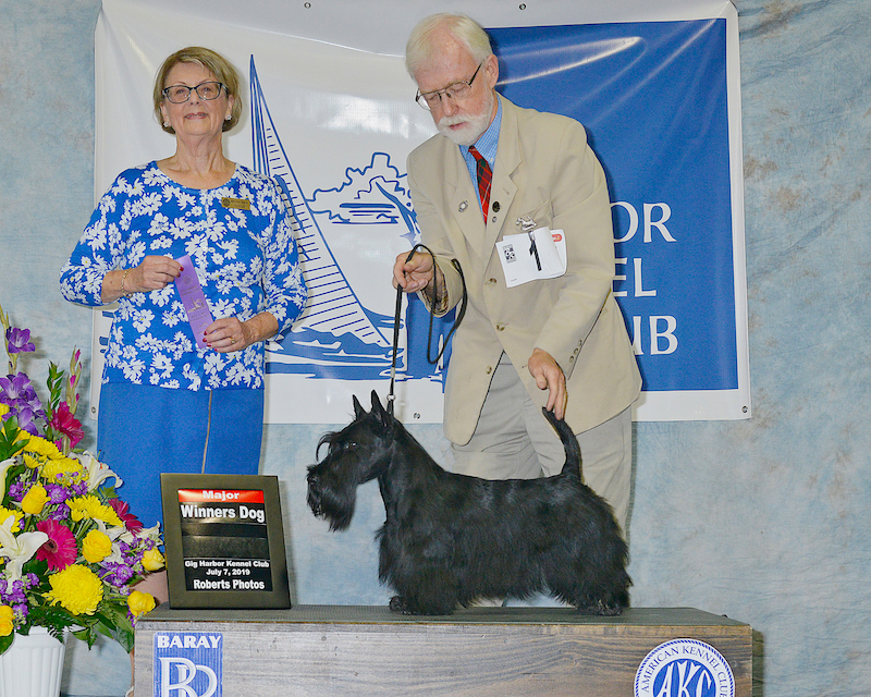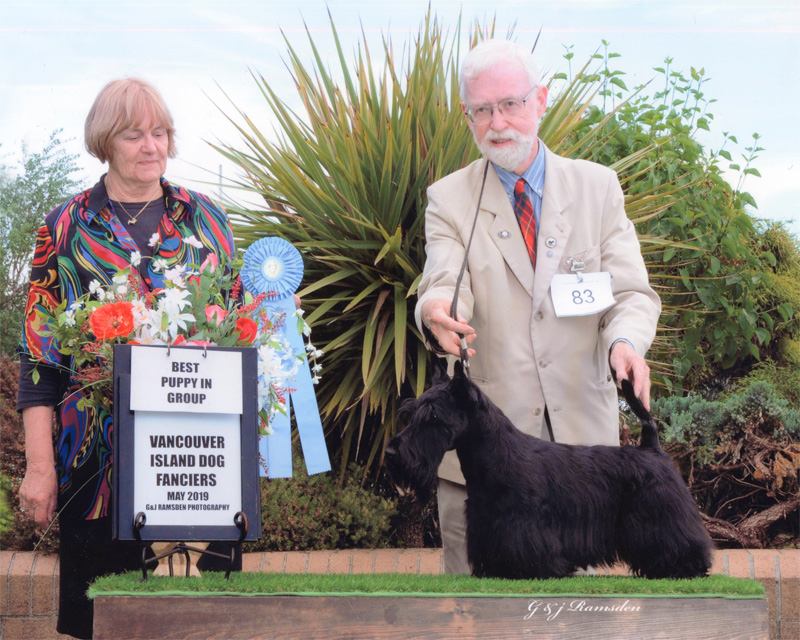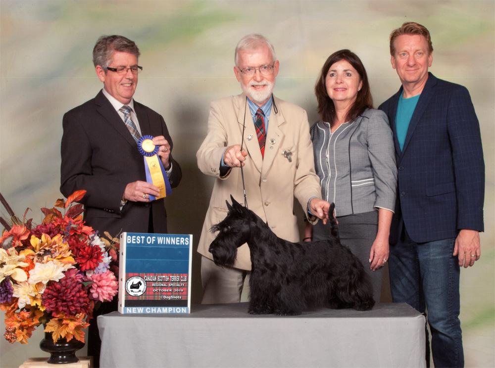 ![]() Sister "Sadie" finishes in style at the Regional Scottie Specialty under Terrier Breeder judge Bruce Fraser, with a 3-point Best of Winners, plus Winners Female at the BCATC Specialty, Oct. 2019 |