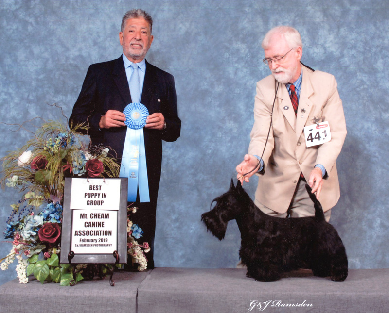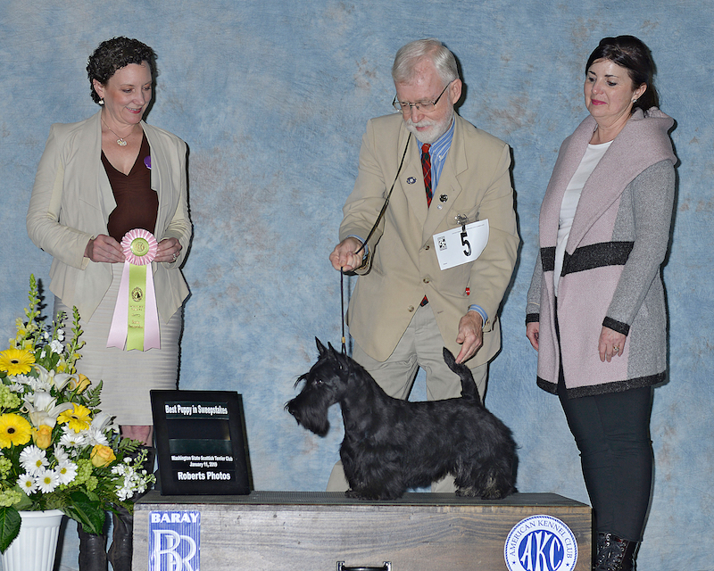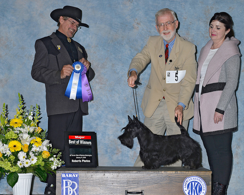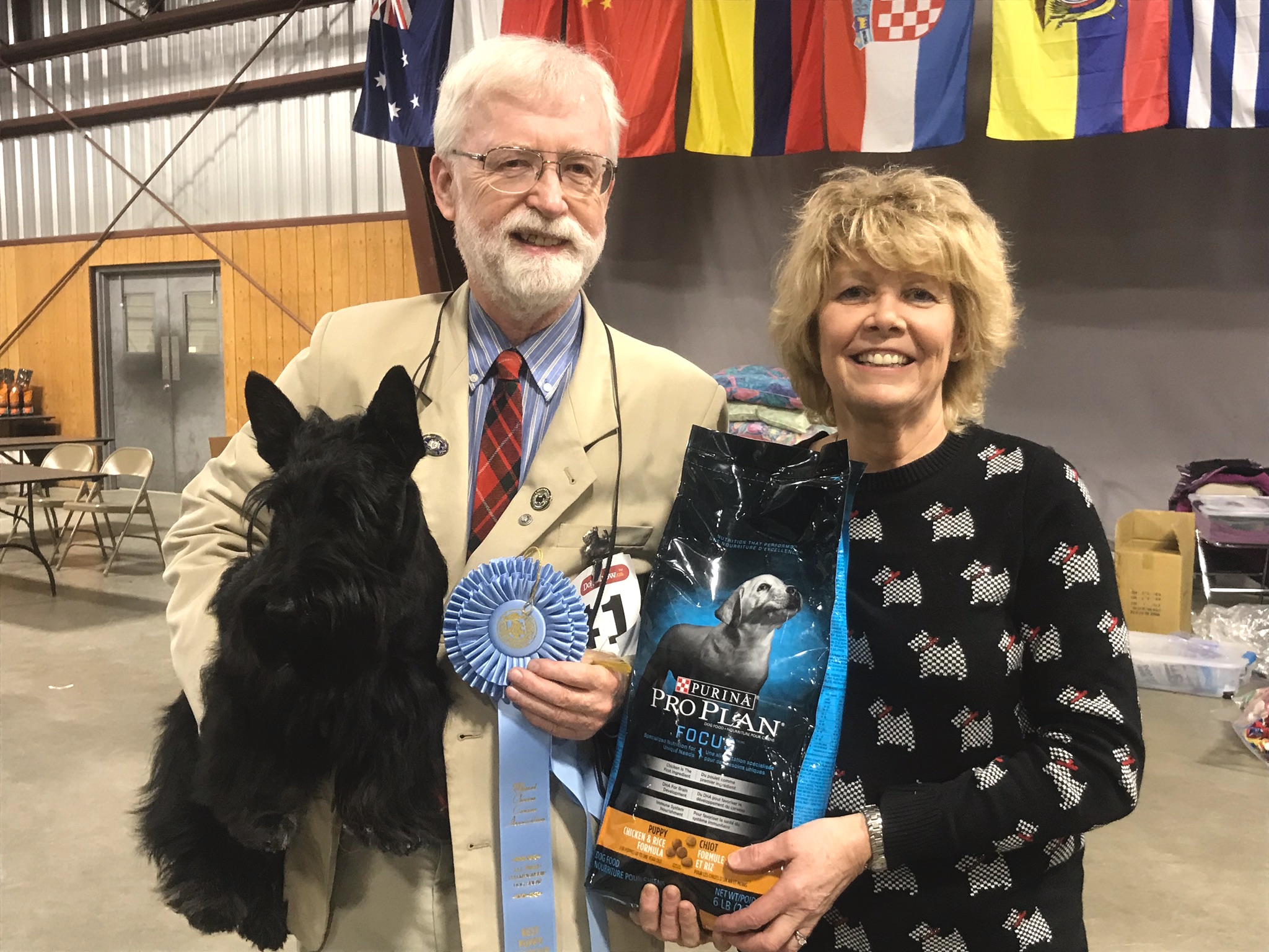 ![]() Barclay winning the Scottie Specialty Sweepstakes under Pilar Kuhn, January 11, 2019 with co-breeder Darlene Lenfesty |