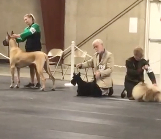 ![]() Barclay winning a 3-point major at his first American show at under 7 months under judge Lucas Herr at the Washington State Terrier Specialty |