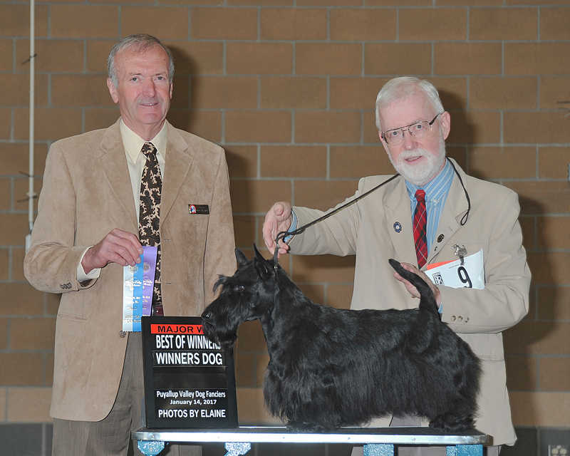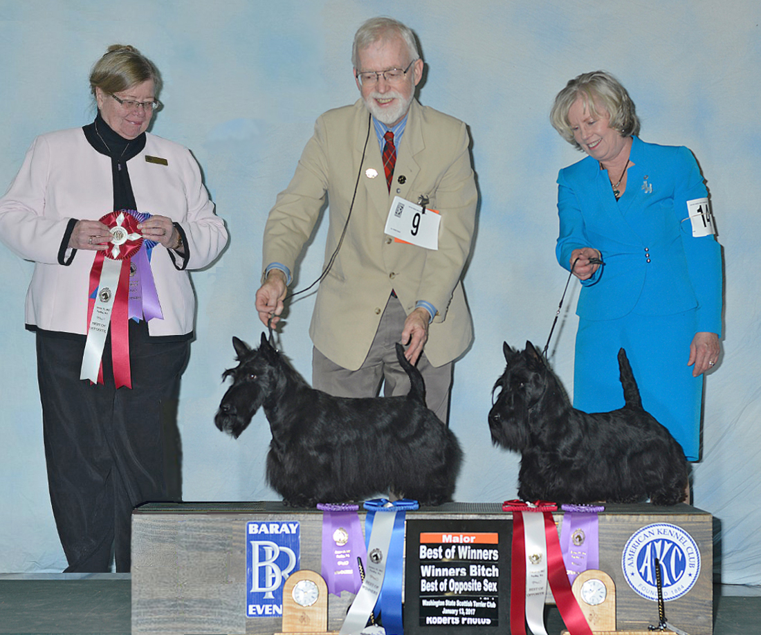 ![]() Bentley going Best of Winners and cousin Aseneth with Charlene Gann (Gallica) going Best of Opposite at the Washington State Scottish Terrier Specialty, Jan. 2017! |