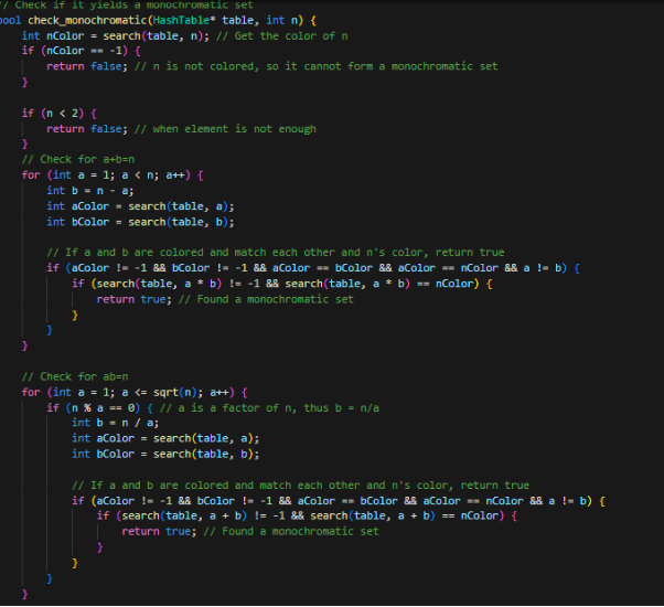 The monochromatic check function utilizes the fact that in the back tracing algorithm I implemented, it assumes the most significant integer to be of \(a + b\) or \(ab\text{,}\) therefore search algorithm breaks down the current integer in the iteration and checks if the number can be of these two cases. The case for \(a + b\) is quite easy where setting a variable \(a\) and let \(a\) iterate through \(1\) to \(\frac{n}{2}\text{,}\) and from subtraction of \(n\) and a we are able to obtain \(b\text{.}\)