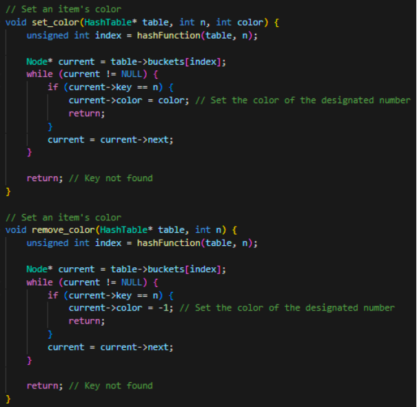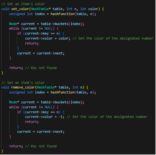 Then, corresponding members functions and helper function is created to manipulate the hash table and functions related to the main loop. Which specifically are the hash function for determining the index, which in this project I chose a relatively easy function to compute for clarity which is the modulus of the hash table size. I have also wrote a set and remove colour for future manipulation on the number's colour. And most importantly the check for monochromatic algorithm.