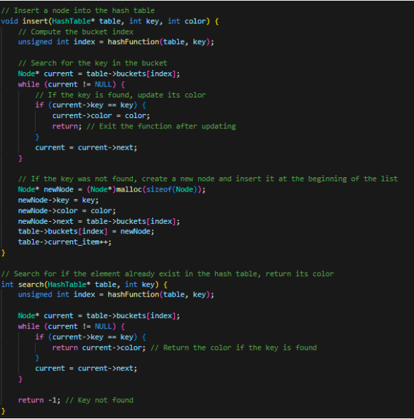 In this part, I will describe my process on implementing the program, how and what did I implement in order to make it work and the execution flow of the program. The data structure that I have decided to use is hash table, the reason is hash table structure allows search and insert for elements in constant which is \(O(n)\) time complexity, and is crucial for handling data set of that larger, in this case is all the 252 integers. Therefore I have created a hash table type and a node element that will be stored in each bucket of the hash table where each node stores the integer and its colouring.