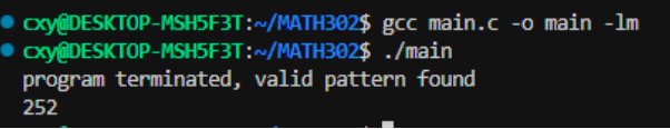 As the picture shows, the program successfully terminated with 252 objects in total in the hash table, which is expected for question 1. However, when trying to change the comparing condition in check-monochromatic function to let a=b, the program ends up running an infinite loop at around 140 elements in the hash table, which indicates that the algorithm determined that 140 elements successfully yields a monochromatic set where as 139 does not, which the algorithm checks repeatedly around these two numbers.