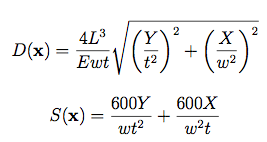 Dimensions: 4The Cantilever Beam functions, used for uncertainty quantification, model a simple uniform cantilever beam with horizontal and vertical loads. The beam length L and displacement tolerance D0 at the free end of the beam are problem constants, with values L = 100 inches, and D0 = 2.2535 inches. The parameters w and t are width and thickness of the cross-section.