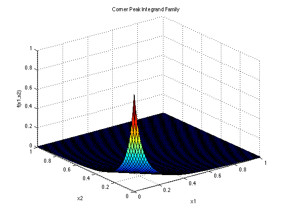 Dimensions: dThe Corner Peak family of functions is quickly integrated analytically, to high precision. In its two-dimensional form, as shown in the plot above, the function is characterized by a flat surface which rises in a sharp peak at one corner of the integration region.
