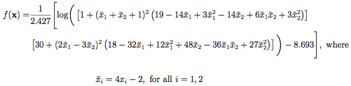 Picheny et al. (2012) use the following logarithmic form of the Goldstein-Price function, on [0, 1]2: