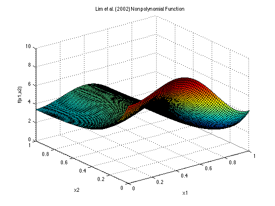 This function is an example of a nonpolynomial model which exhibits a shape similar to that of a multivariate polynomial. Lim et al. (2002) compare predictions from this function with predictions from the Lim et al. (2002) Polynomial Function, due to the similarity in their shapes and y-ranges.