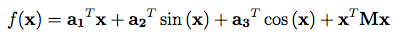This function's a-coefficients are chosen so that 5 of the input variables contribute significantly to the output variance, 5 have a much smaller effect, and the remaining 5 have almost no effect on the output variance. Values of the coefficient vectors a1, a2 and a3, and the matrix M, can be found at: