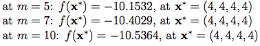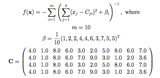 Dimensions: 4The Shekel function has m local minima. Above are the recommended values of m, the β-vector and the C-matrix; β is an m-dimensional vector, and C is a 4-by-m-dimensional matrix.