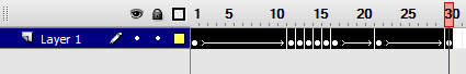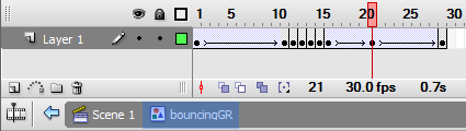 7. Now we are going to animate the ball and make it bounce up and down. Click on frame 30, right-click and select 'Insert Frame' to extend the frame for 30 frames. Next right-click anywhere in the long frame that was just created and select 'Create Motion Tween'. Note that when we create the motion tween the long frame turns blue and the rectangle at the end disappears. The layer also now has a Tween icon next to its name.
