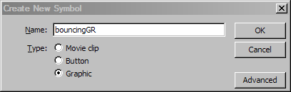 3. Create a new symbol named bouncingGR(you can use anything you want), select Graphic as its type and click OK;