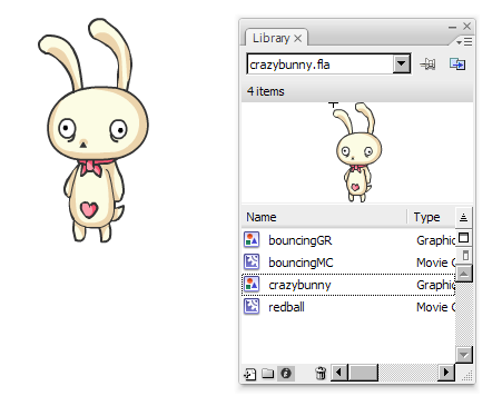 3. Drag the crazybunny graphic symbol to the stage(or if you have not imported it yet, just import the crazybunny.swf file and convert to a symbol) ;