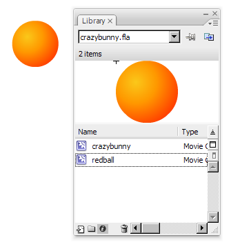 6. After you are happy with what you got, click on the ball and hit F8 or Right-Click >>Convert to Symbol; set the symbol time to movie clip; note that the symbol you've just created is now in the library; then delete everything in the stage and drag the movie clip: redball to the stage in frame 1.