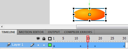 10. Finally, move the shuttle to frame 15 again, select the Free Transform Tool from the toolbar and squeeze the ball a bit at the top and stretch the ball a bit at the sides.