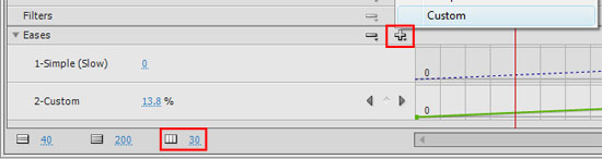 11. Gravity speeds things up when they are falling, if you need more touches of real-world physics, you can use Easing In/Out to make your object move more naturally. Simple easing can be done by clicking on the tween and adjusting the Ease in the property tab. If we had seperated this into two tweens, we could have set one to ease in and one to ease out. However, we want one tween to both ease in and ease out. Custom easing in Flash CS4 is handled through the Motion Editor. Select the Motion Editor tab next to the Timeline tab. Scroll down to the secion labeled 'Eases', click the + sign and select Custom (the red box in upper right of the diagram below). Make sure that the scale indicates 30 (the red box in the lower left below).