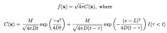 The Environmental Model function models a pollutant spill caused by a chemical accident. C(x) is the concentration of the pollutant at the space-time vector (s, t), where 0 ≤ s ≤ 3 and t > 0. I is the indicator function.