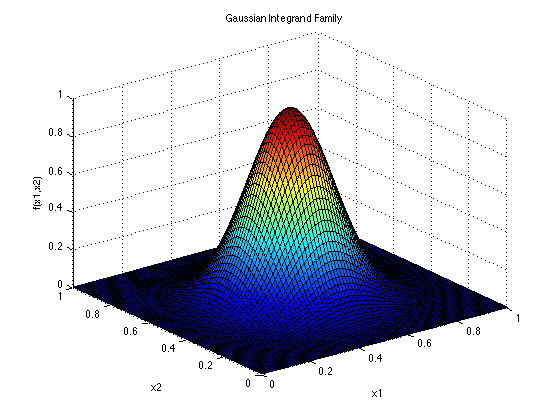 Dimensions: dThe Gaussian Peak family of functions is quickly integrated analytically, to high precision. In its two-dimensional form, as shown in the plot above, the function shows a distinct two-dimensional Gaussian peak in the centre of the integration region.