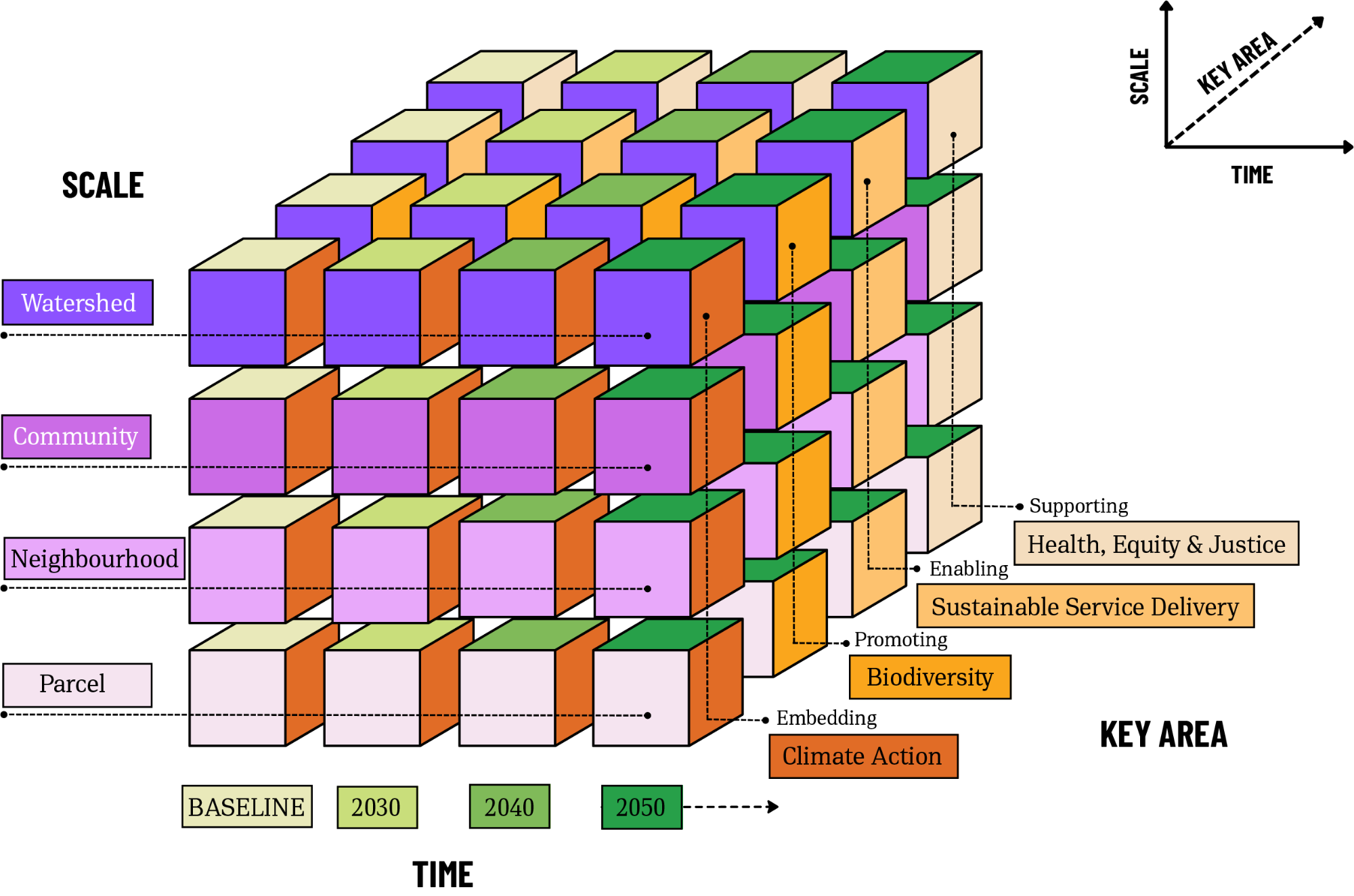 Across the globe, NbS projects are being implemented at different scales. While some NbS practices are based on multi-lateral arrangements (e.g., Québec and California’s Linked Cap-and-Trade program) or national policies (e.g., Canadian federal conservation programs), the NSI is focused on NbS at regional and local scales that have direct ecosystem and community benefits. Specifically, the NSI investigates NbS that are being implemented at the watershed, neighbourhood, community and parcel scales, and how to bring cohesion to NbS projects and plans both within communities and across watersheds.