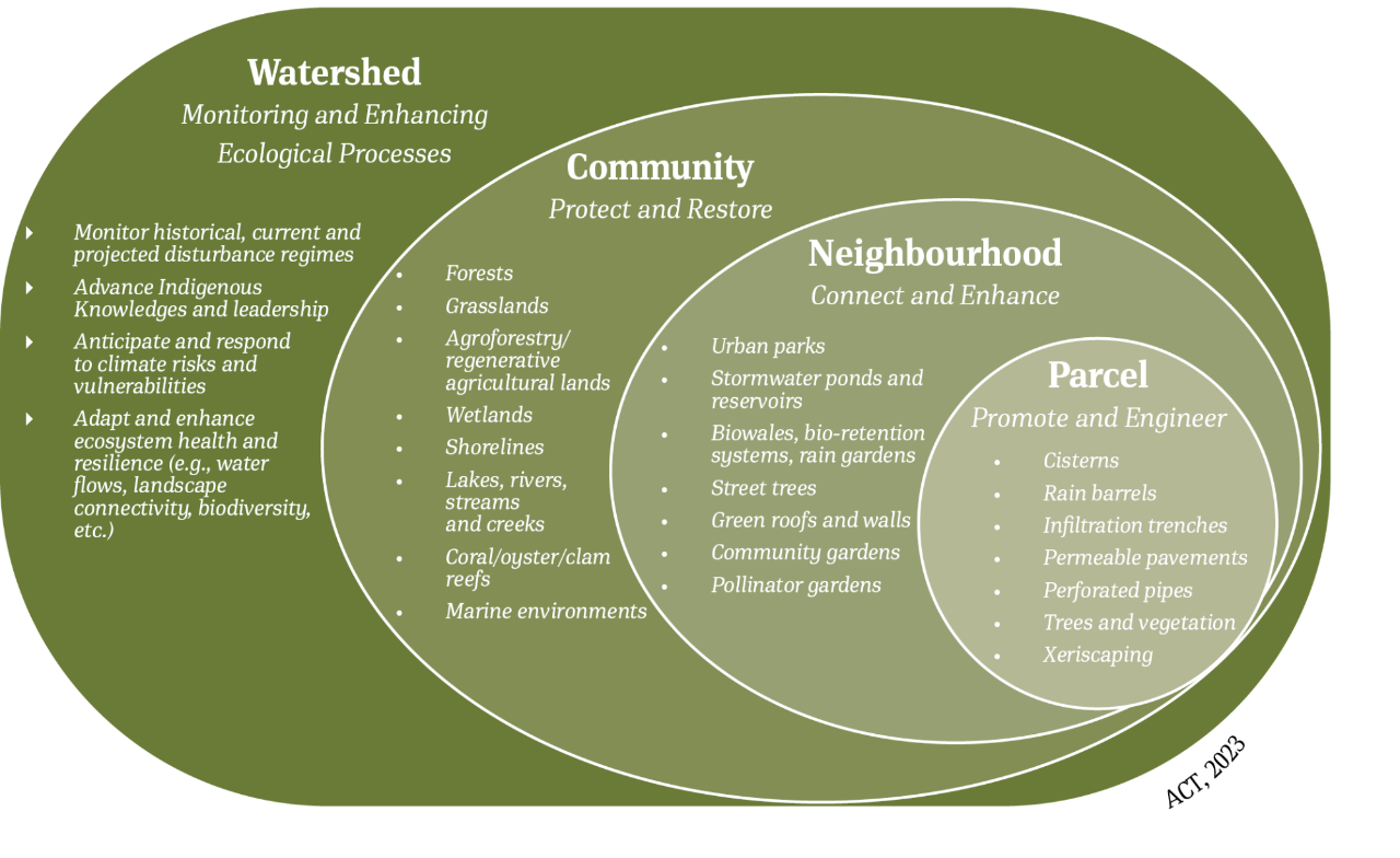 Figure 3 below depicts the diverse NbS activities being applied across four scales. It is an abbreviated depiction of a broad review of scholarship and practice, and showcases the interdependencies between scales and the need for more cohesive NbS planning to support and enhance ecological processes and ecosystem services across scales. Ensuring that baseline ecological data and key indicators of health and resilience at the watershed scale are the foundation of NbS planning and practice helps to ensure that NbS are being applied across scales in a way that supports nature and, by proxy, the communities that benefit from a functioning and healthy ecosystem.