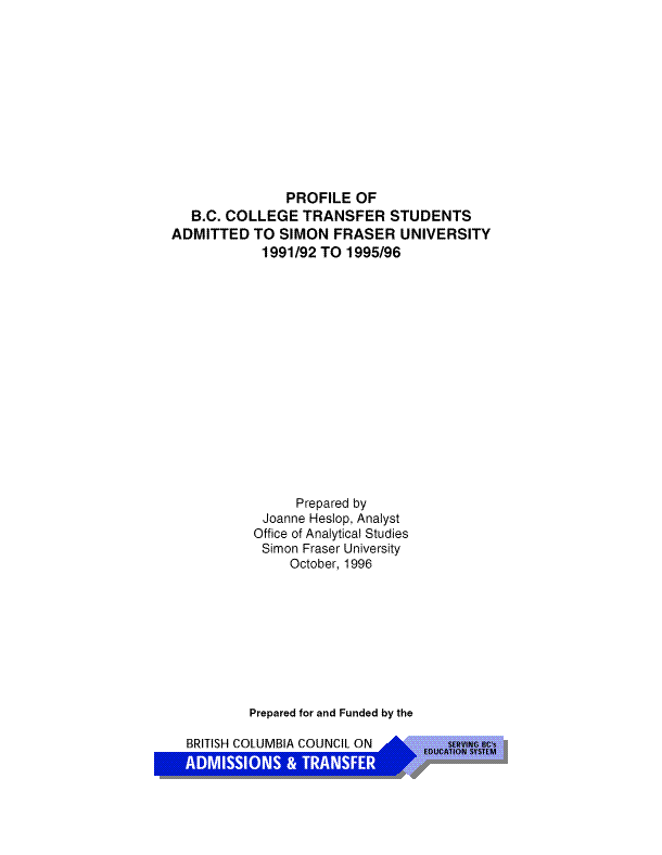 This report provides a profile of transfer students admitted to Simon Fraser University from B.C. Colleges over the past five years, from 1991/92 to 1995/96. Transfer students represent approximately one third of Simon Fraser's new student admissions.