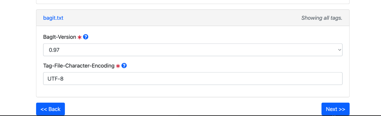If you click the Show All Tags button on the Bag Metadata page, two fields are available in the bagit.txt section.