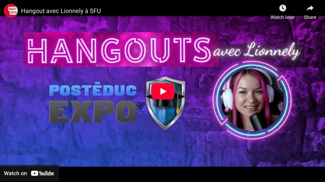 Tune in with your class or school to this 60-minute interactive French show highlighting post-secondary student life in French in a captivating way. Hosted online, streamer Lionnely will meet with four SFU students and one alumnus to talk about their inspiring journeys studying in French and their experience on campus.