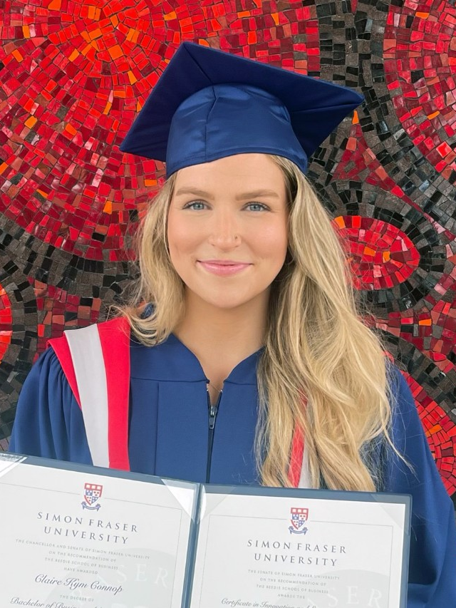 Claire Connop completed her BBA with a concentration in marketing as well as the Charles Chang Certificate in Innovation and Entrepreneurship. She also completed two co-op terms, including one eCoop term where she was able to launch her own non-profit, the Glow Within Foundation. Glow Within is a Vancouver-based organization that aims to empower feminine-identifying high school students through conducting educational workshops on women’s physical, mental and emotional health. Glow Within has worked with over 10 schools, educated over 600 students and conducted over 100 workshops.