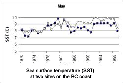 Ocean temperatures vary both in the short-term (within and among years), and the long term (over periods of many decades), dramatically affecting marine ecosystem processes. For example, in the California Current, ocean temperatures increased through most of the second half of the 20th century, peaking in the mid-to-late 1990s.