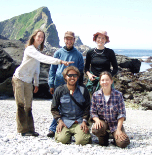| Part of our intrepid 2005 field crew: standing, from left to right, Camp Manager BriAnne Addison, with field assistants Mathieu Charete, and Jasmine Freed; and kneeling William ("don't call me Willie") Nelson, and Allison Henderson. | ||||||||||||||||||||
