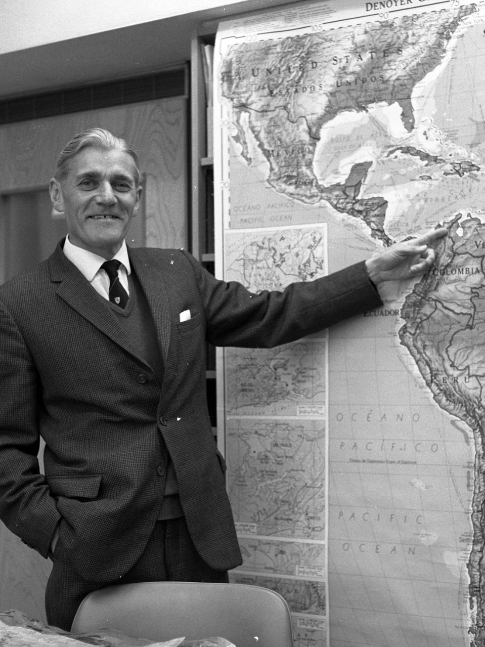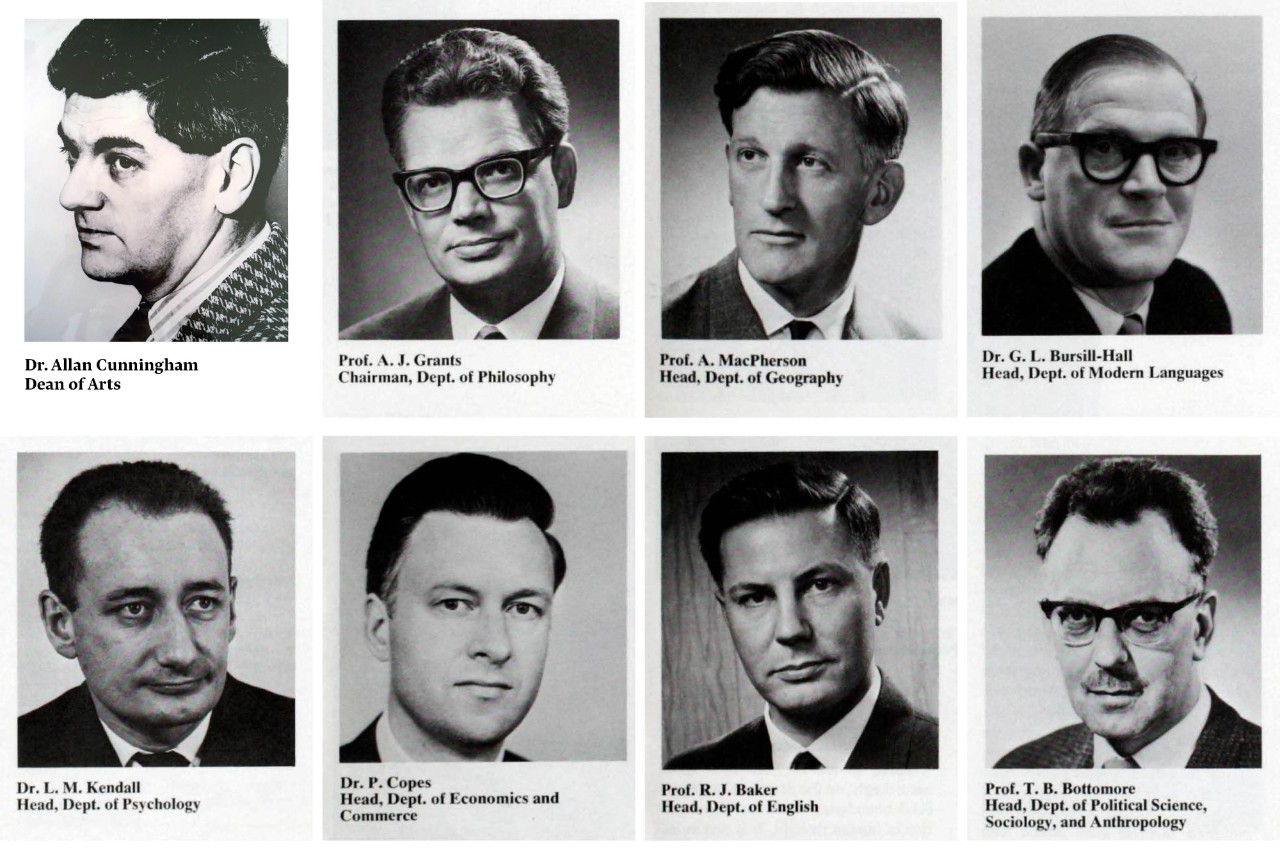 The first Dean of Arts and charter department head in History, Allan B. Cunningham, had a brother in the Department of Geography: charter faculty member Frank Cunningham (pictured). Both studied at Durham University in England and were avid mountaineers together. The Peak of the Brothers in the Andes is named after the brothers.