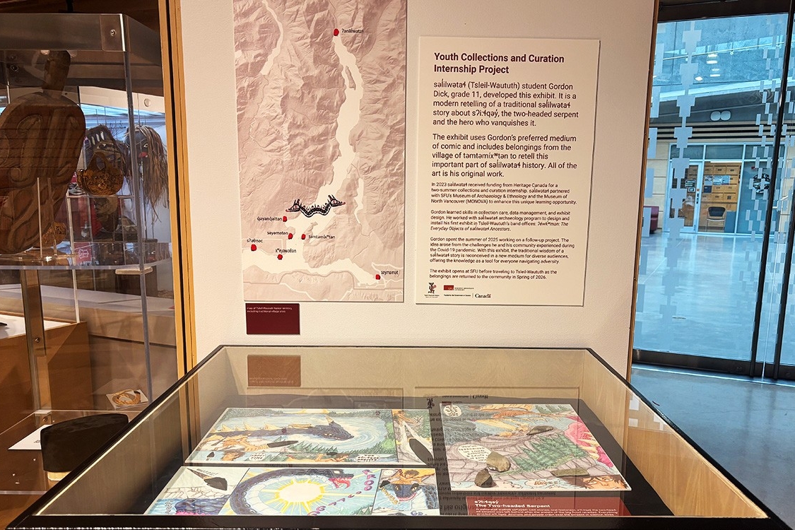 The new exhibit features 33 artifacts belonging to səlilwətaɬ (Tsleil-Waututh) Nation, superimposed on large comic book pages drawn in fine lines and bold colour by səlilwətaɬ artist and grade 11 student Gordie Dick.