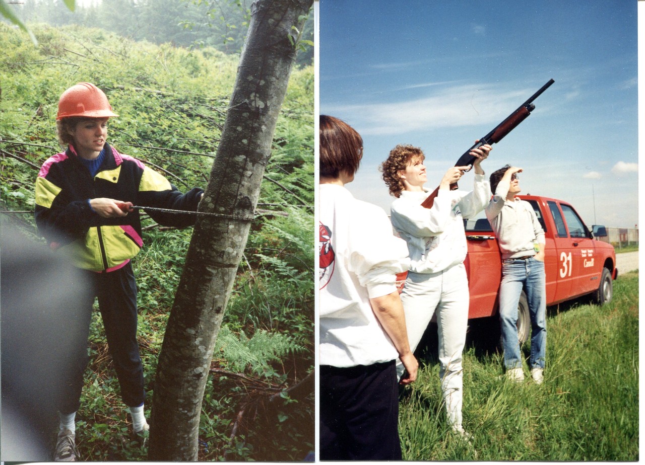 Therese Poland girdling a tree and shooting a bird scaring cartridge during MPM summer courses 1991