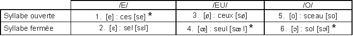 Nous observons que la variante mi-fermée apparaît toujours en fin de syllabe, et que la variante mi-ouverte apparaît toujours suivie d'une consonne.