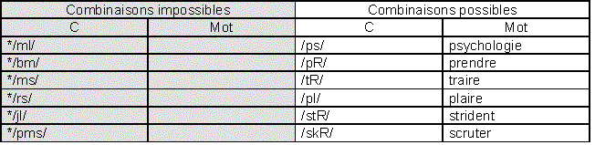 - Chaque langue permet certaines combinaisons de phonèmes; par exemple :
