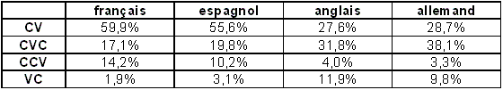- Les structures syllabiques préférées du français sont CV alors que l’anglais préfère les structures CVC