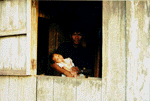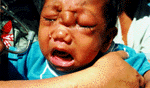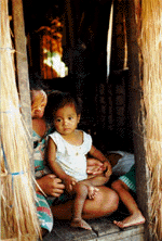 Magadaleno holds his 2 year old daughter Alona. His wife and two week old boy were just buried. Unfortunately the child in his arms does not survive either.