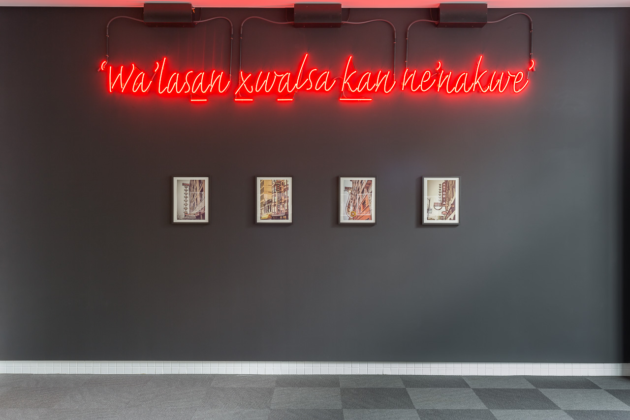Marianne Nicolson ('Tayagila'ogwa) is of Scottish and Dzawada'enuxw First Nations descent. Her artistic and academic practices are platforms to advocate for Indigenous linguistic and cultural resurgence. Her work has been exhibited at Vancouver Art Gallery, Art Gallery of Greater Victoria, National Indian Art Centre, UBC Museum of Anthropology, 17th Biennale of Sydney, National Museum of the American Indian, Confederation Centre for the Arts, and Taipei Fine Arts Museum. She has undertaken numerous public artworks. She holds a PhD in Linguistics and Anthropology from University of Victoria, an MFA in Visual Art from University of Victoria and a BFA from Emily Carr Institute of Art & Design. The work in the SFU Art Collection is the neon in the image above.