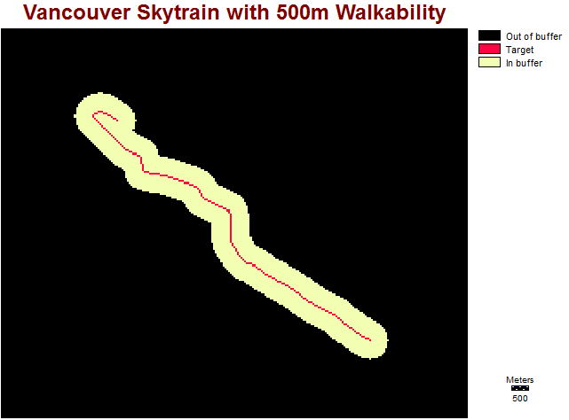 Then in IDRISI I set a 500m buffer around the Skytrain as it is a suitable distance to walk to and from the skytrain to catch any other forms of public transit which is within walking distance.