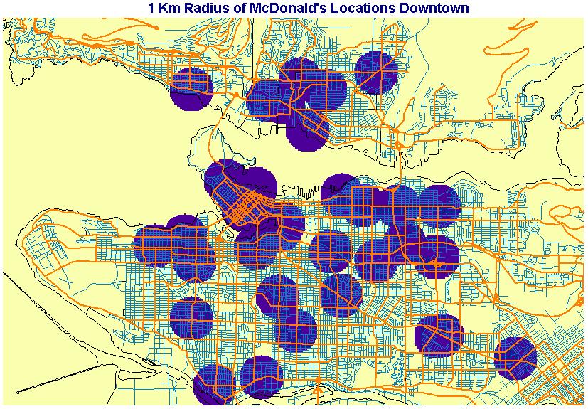 This map shows how McDonald's has managed to service all of the Downtown core, and much of the rest of Vancouver, within a 1 km radius.