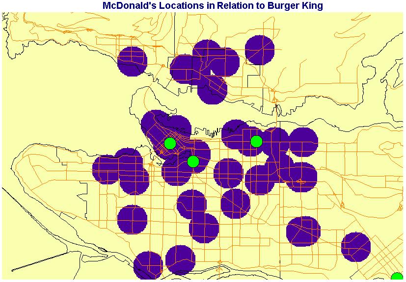 This map indicates the relative locations of Burger King Restaurants (Green areas) in comparison to McDonald's (Purple areas), as well as their catchment areas.