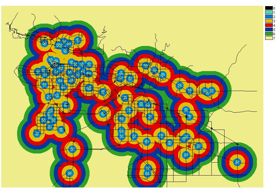 surrounding colour indicates the distance that must be travelled to reach